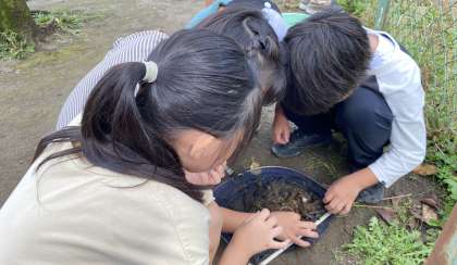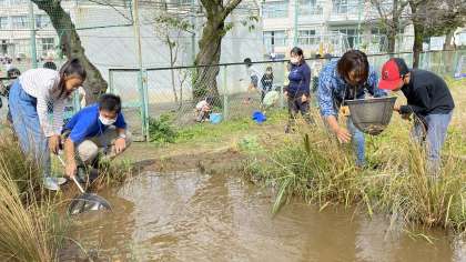 ビオトープの学習を進めています。今日は、講師の先生からアドバイスをいただきながら、ビオトープに生息する生き物を捕獲し、観察しました。