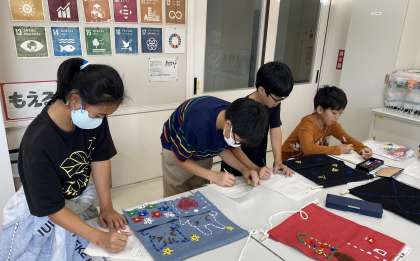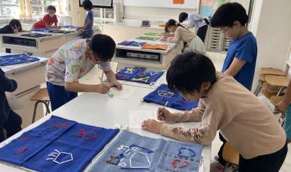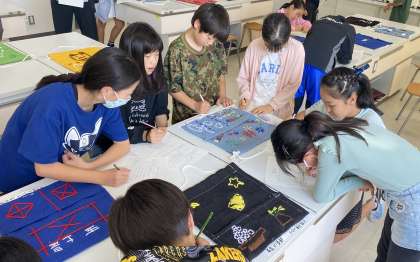 ウォールポケットの作品にタイトルをつけて完成です。友達とお互いの作品を見合い、鑑賞会を開きました。作品のよさをたくさん見つけて、カードに書きました。