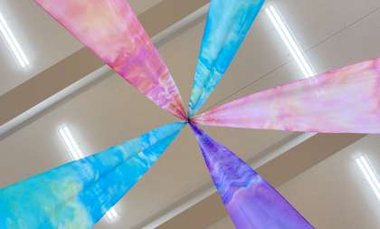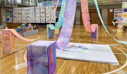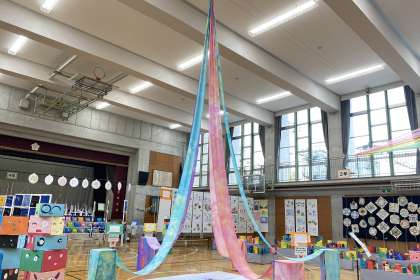 長さ10メートルのさらしに、凧染料で色をつけました。テーマは夢の色です。そーっと中に入り、寝転がると虹のような夢を味わうことができます。虹色のまくらは、展覧会実行委員が制作しました。