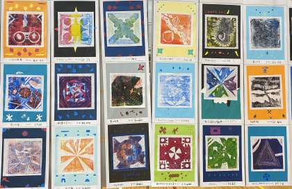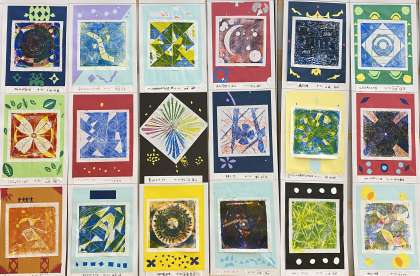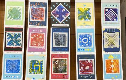 初めての彫刻刀にドキドキしながら、木版画にチャレンジしました。慣れてくると、彫る時の心地よい音を楽しむことができました。インクをつけて刷り上がった時は「おぉー」とうれしい声がたくさん聞こえました。