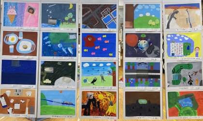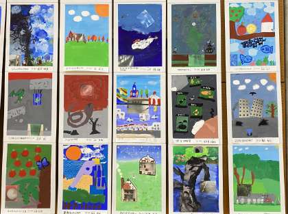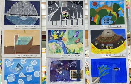 写真の周りには、どんな世界が広がっているのかな?とイメージを広げて表しました。よく見ると、見たことのある玉堤小の廊下や階段の写真もありますね。周りに広がるのは、見たことのない世界。言葉では表せない世界を、形と色で表しました。
