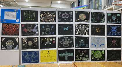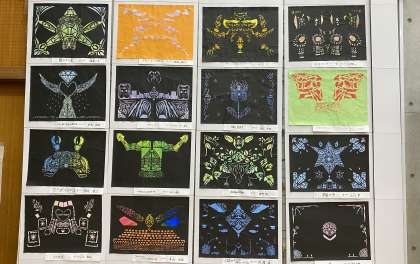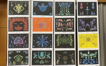 半分に折った紙を、小さくカッターナイフで切り取るところからはじめます。折った紙を広げてみると、左右同じ模様ができます。折って切って開いて…を繰り返しながら表したい形を見つけました。切り絵の楽しさや難しさを感じながらイメージを広げ、素敵な世界をつくり上げました。
