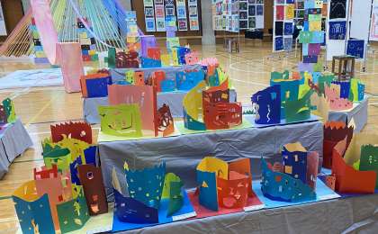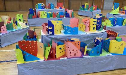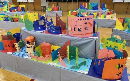 色画用紙を立てて、カラフルな建物を表現しました。初めてのカッターナイフでの作業に緊張しながらも、窓や階段など細かい部分にもこだわって作り上げました。