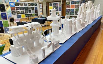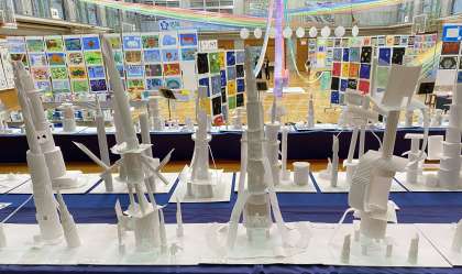 波段ボールを切って、くるくる丸めます。立てて積み重ねると、タワーになりました。窓や入口、全体のデザインなどにこだわりながら、表しました。うまく立たなくて大変なこともあったけれど、試行錯誤を繰り返して完成させました。