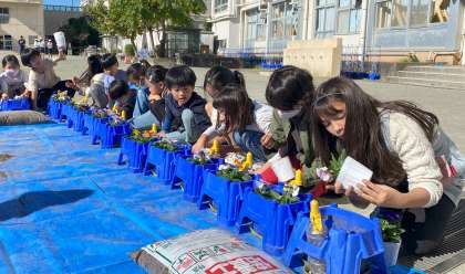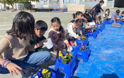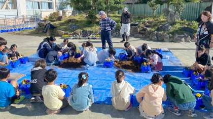 「花の栽培授業」を行いました。パンジーの苗の植え方を教えていただき、一人一人の鉢に植えました。好きな色のパンジーを二株選び、パンジーに名前を付けて話しかけながら植えていました。世田谷花卉園芸組合の方にお世話になりました。