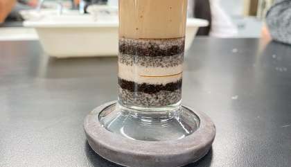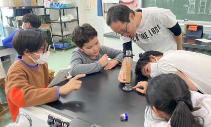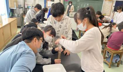 「大地のつくりと変化」について、学習を進めています。大きさの異なるつぶが水中でどのように堆積するか、コーヒーがらを礫に、片栗粉をどろに見立て、実験をして確かめました。