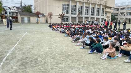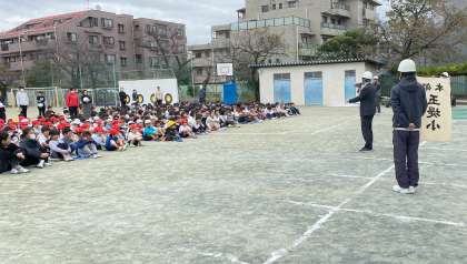 主事室から出火し、放送機器が使えない想定で実施しました。主事が口頭で廊下から子どもたちに火災が発生していることを伝えると、素早く安全に避難することができました。