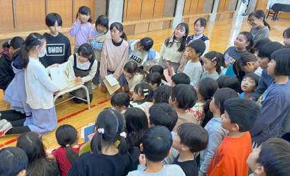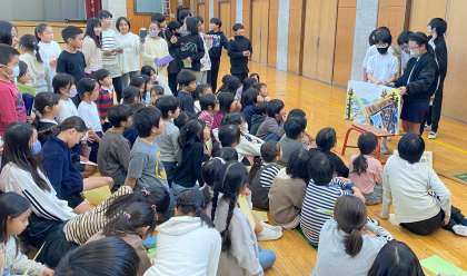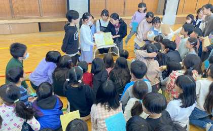 今週は、読書週間です。図書委員のメンバーが工夫をして、様々な活動をしています。写真は、体育館で読み聞かせをしているところです。