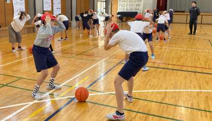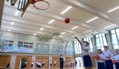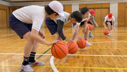 東京羽田ヴィッキーズの方をゲストティーチャーにお招きし、バスケットボールの授業を行いました。コーディネーショントレーニングでウォーミングアップをして、ドリブル、シュートの基本的な運動技術について学びました。