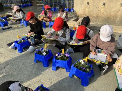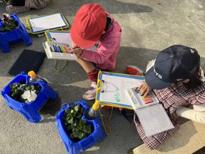 花の栽培授業で植えたパンジーの観察をしました。花は綺麗に咲き、次に咲く花の蕾もたくさんできていました。色や形、大きさや長さなど観察のポイントを意識して観察できました。