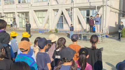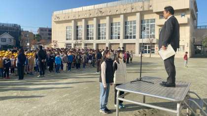 校長は、先週まで行われていた読書週間の成果と詩人、谷川俊太郎さんの詩「いち」を朗読して、生き方についてお話しました。次に、はたらく消防の写生会で入選した児童の表彰を行いました。運動委員は今週から始まるスポーツチャレンジについて説明しました。看護当番の教員は、今週の目標「落ち着いて生活しよう」についてお話しました。