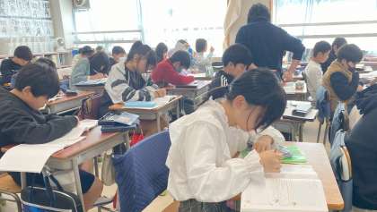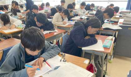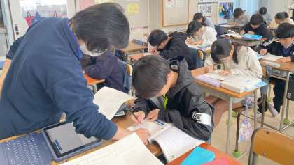 「拡大図と縮のかき方」について、学習しています。はじめに三角形の2倍の拡大図や2分の一の縮図のかき方を考え、実際にかいて拡大図、縮図のかき方について学びました。次に、様々な形の拡大図、縮図をかいて理解を深めました。
