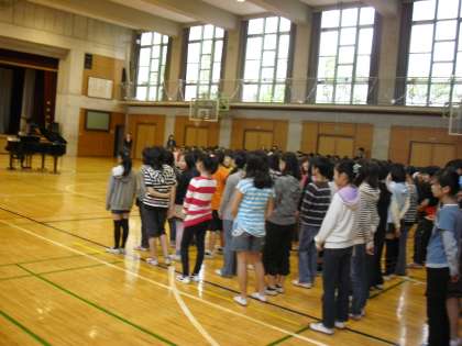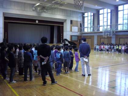 子どもの日を祝う「こうのぼり」の歌を元気よく歌いました。1年生も今日から音楽朝会に参加しました。