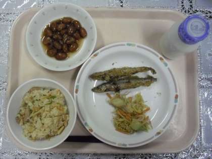 今日のメニューは、筍ご飯、シシャモの磯辺揚げ、野菜のゴマだれかけ、煮豆、牛乳でした。
