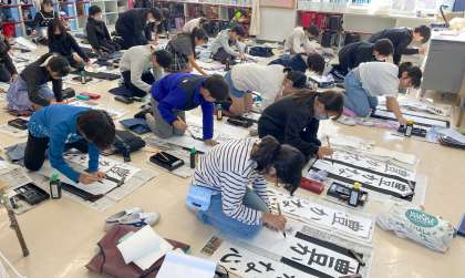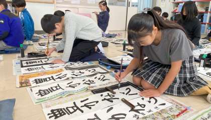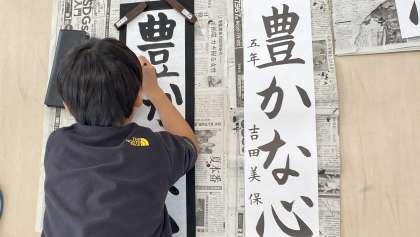 書き初め『豊かな心』の練習に取り組んでいます。張り詰めた空気の中で、子どもたちは真剣に文字を書いていました。