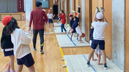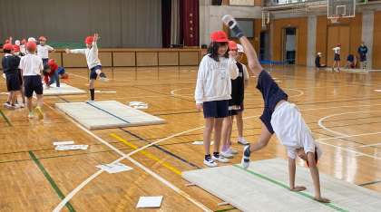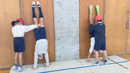 子どもたち一人一人がめあてをもって「マット運動」に取り組んでいます。今日は、壁倒立と側方倒立回転の技を中心に、友達と教え合い、助け合いながら学習していました。