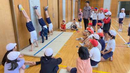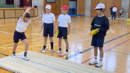 後転、壁倒立、側方倒立回転を中心に学習を進めました。子どもたちが技のポイントを発見し、全体に広げていきます。ポイントが分かると意欲的に練習し、見る見る上達していきました。わかって、できる体験を積み重ねています。