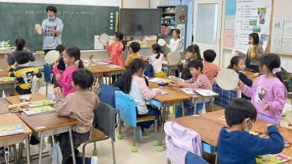 「いろいろな おとを みつけて ならしましょう」の学習をしています。タンブリン、トライアングル、カスタネット、ウッドブロックで、いろいろな音を見つけて、楽しみました。
