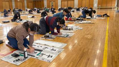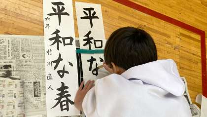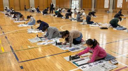 書き初め『平和な春』の練習に取り組んでいます。体育館で学年合同授業を行いました。張り詰めた空気の中で、子どもたちは真剣に文字を書いていました。