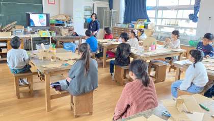 「クミクミックス」の学習を進めています。安全に正しく段ボールカッターを扱い、段ボールを様々な形に切ります。切った段ボールに切れ目を入れて、組み合わせて形を作っていきます。子どもたちは作りながらさらにイメージが膨らんでいました。