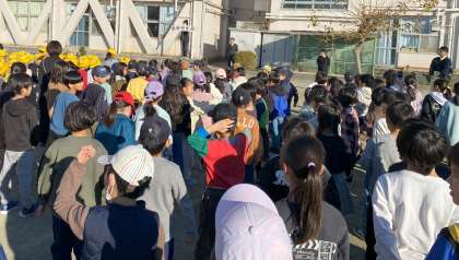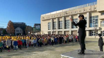 最後に全校児童で校歌を歌い、2学期を締めくくりました。式の終了後、生活指導担当の主幹教諭は、子どもたちが素敵な冬休みを過ごすことができるように「ふ・ゆ・や・す・み」の頭文字をキーワードにしてお話しました。子どもたちは予想しながら集中して聞いていました。