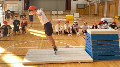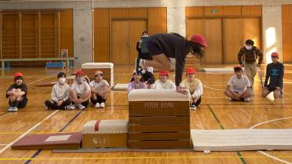 「跳び箱運動 切り返し系の技」開脚跳び、かかえ込み跳びに取り組んでいます。始めに、担任の師範を見て、技のポイントを見つけ、めあてを立てて練習しました。場を工夫し、スモールステップで練習を重ねたことで、普通の場で初めて跳び越すことができた子がたくさんいました。