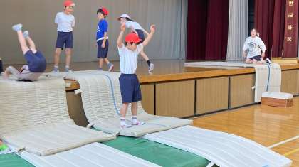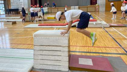 「跳び箱運動 回転系の技」台上前転、首はね跳びに取り組んでいます。自分たちで発見した、技のポイントを友達同士伝え合いながら練習していました。安心して技に挑戦できる場も工夫しました。
