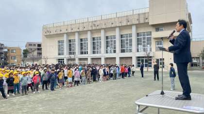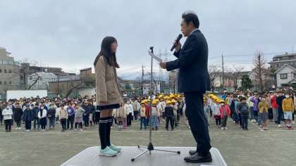 校長は、来年度から開設される特別支援教室の名称について、子どもたちの投票で「カワセミ」に決定したこと、また、「素直に謝ることの大切さ」についてお話しました。次に、世田谷区フェアトレードチョコパッケージデザインコンテスト「未来に残したい大切な世田谷の風景」で入選した児童の表彰を行いました。環境美化委員は、環境に優しい土づくり講座の開催について、呼びかけました。看護当番は、今週の目標「手洗いをしかりしよう」についてお話しました。
