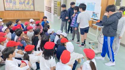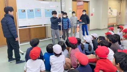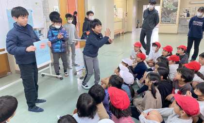 休み時間に体育館前で、5年生の環境美化委員が、1年生を対象に分かりやすくミミズの役割やハサミムシについて解説しました。1年生は興味津々でたくさん質問していました。