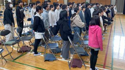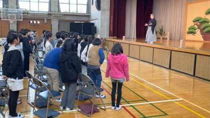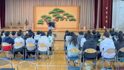 古典芸能鑑賞教室を本校体育館で実施しました。ワークショップでは、狂言のセリフの言い方、所作などを体験しました。その後狂言師の方に「附子」を見せていただきました。