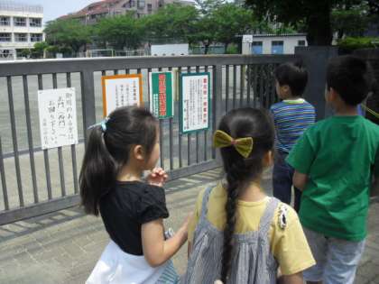 4年生が社会科の学習で「防災教育」を意識して、地域の防災設備等を調べる学習を行いました。日ごろ何気なく歩いている道に「消火栓」と書かれ、黄色い縁取りがしてある蓋を見つけ、「こんなにたくさなる」「知らなかった」「消火器も多いね」など新たな発見をしていました。