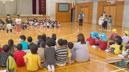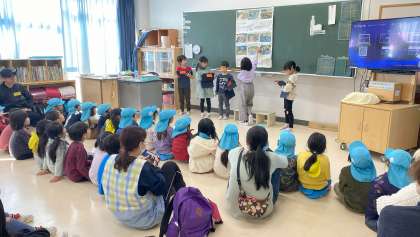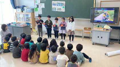 近隣保育園の子どもたちと交流会を開きました。生活科「もうすぐみんな2ねんせい」の授業の一環で、玉堤小学校のすてきなところを保育園の子どもたちに伝えました。