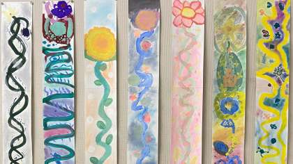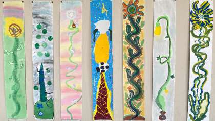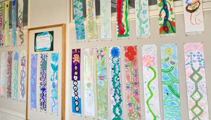 「ニョキニョキの花」なぞの種を植えたら…。芽が出て、にょきにょき茎が伸び、花が咲きました。色の重なり、かすれ、マーブル、ドリップなど表し方を工夫して、豊かに表現しています。筆を素早く動かしたり、押しつけたり、筆先で細く描いたり、子どもたちは伸び伸びと作品づくりを楽しみました。完成した作品は、教室前に掲示しています。