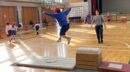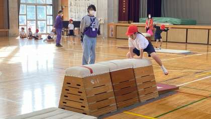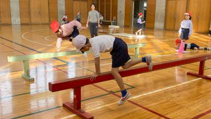 様々な動きに挑戦して、楽しみなが学習を進めています。工夫した場で子どもたちの運動感覚を養っていきます。体を支える感覚やピタッと着地する動きなど、跳び箱運動につながる基本的な動きがたくさん見られました。