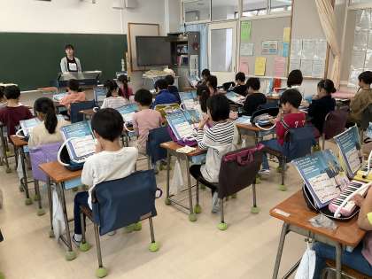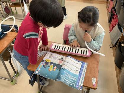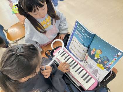 「ようすをおもいうかべよう」では、鍵盤ハーモニカで「きらきらぼし」を吹けるように練習しています。ピアノの伴奏に合わせて上手に吹くことができました。先生の合格をもらった児童は、ミニ先生として、友達の練習のお手伝いをしました。