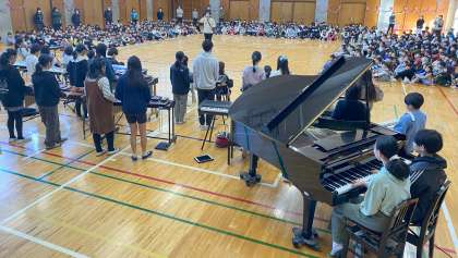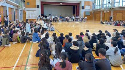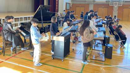 体育館で音楽朝会を行うのは、4年ぶりになります。合奏クラブの児童が、「宝島」の演奏を披露しました。練習の成果を十分に発揮していました。全校の子どもたちから、素晴らしいい演奏だった感想を伝えられ、嬉しそうにしていました。