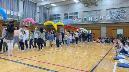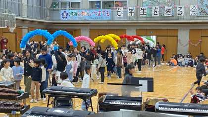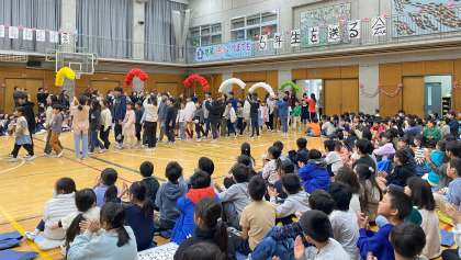 1年生と6年生が手をつないで入場しました。花のアーチを担当したのは、3年生、4年生、です。体育館の輪飾りは1、2年生が担当しました。体育館で6年生を送る会を実施するのは4年ぶりになります。