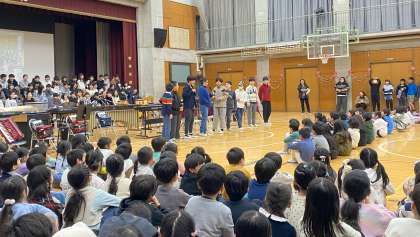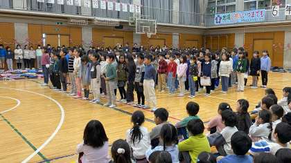 2年生は、この1年間で身に付けた九九で6年生と速さ対決をしました。6年生のスピードに全校の子どもたちは驚いていました。一生懸命練習した歌「メッセージ」を心を込めて歌いました。