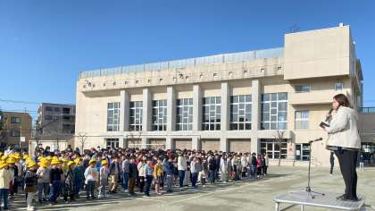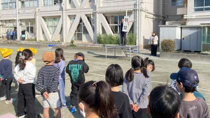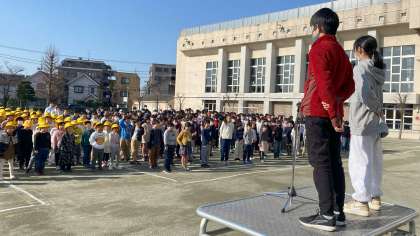 雲一つない青空の下で、久ぶりに校庭で全校朝会を行いました。校長は、昨日の桃の節句、明日の啓蟄についてお話しました。また、昨日行われた東京マラソンで準優勝し、今日玉堤小学校に来校する車いす陸上選手について紹介しました。次に6年生の代表児童が図工の時間に作成した作品「カメレオン」が校舎内に出没することを伝えました。看護当番は、今週の目標「気持ちのよいあいさつをしよう」についてお話しました。