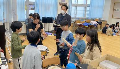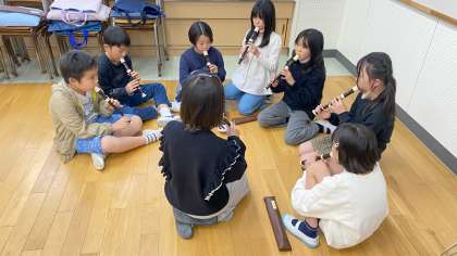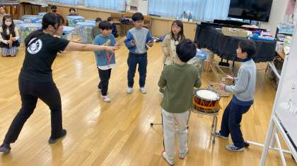 「お囃子づくり」をしました。祭り囃子の楽器を使って、旋律やリズムを友達と協力してつくりました。大太鼓の代わりにバケツ太鼓、締太鼓の代わりに小太鼓、拍子木の代わりにクラベス、篠笛の代わりにリコーダーを使うなど、お囃子の雰囲気が味わえるように工夫しました。