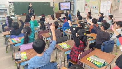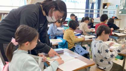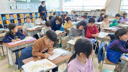 1年間の学習のまとめをしています。教科書の挿絵の場面をみて、今までに学んできた算数、たし算、ひき算、かけ算、長さ、時刻などが問題づくりに使えるか考えます。例題を解いた後で、問題づくりをしました。