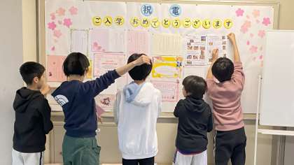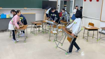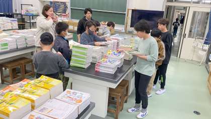 新年度準備の4月5日は、6年生が大活躍の日です。写真は、机、椅子の移動や、祝電の掲示、教科書配布の準備をしているところです。