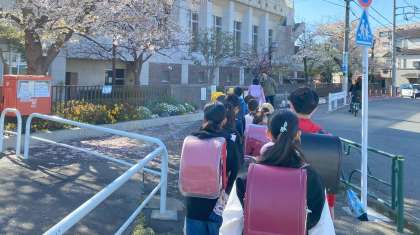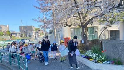 地区班ごとに1年生〜6年生が一緒に登校する集団登校を実施しています。昨日は、雨と風で大変でしたが、今日は快晴で子どもたちの笑顔も光ります。上級生が下級生に優しく声をかけています。PTA校外委員の皆様にお世話になっています。