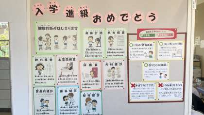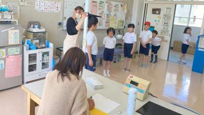 身長と体重の計測を行っています。年度始めなので、保健室の使い方やルールについても確認しました。