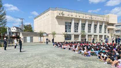 今年度、第1回目の避難訓練を実施しました。想定は、学校近隣民家の出火です。短時間で全員の無事を確認することができました。火災の際、火がどのくらいのスピードで進んでいくのか確認しました。