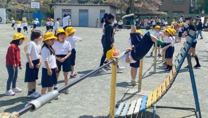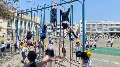 校庭デビューをした1年生は、伸び伸び楽しそうに遊んでいます。上級生との関わり合いも微笑ましいです。上級生が、遊び方の手本を示しています。
