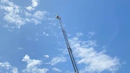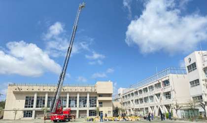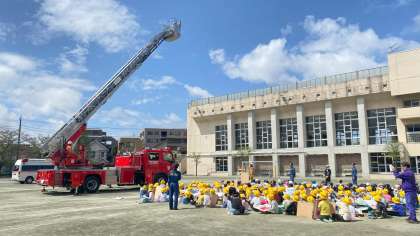 写生会の後には、はしご車がどのように救助にあたるのか、デモンストレーションをしてくださいました。30メートルの高さまで梯子が伸びると歓声が上がっていました。