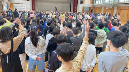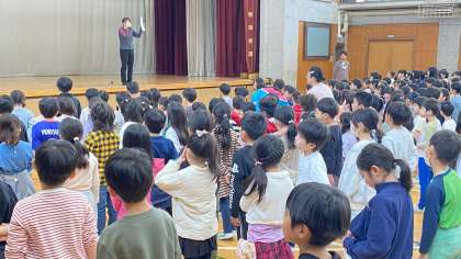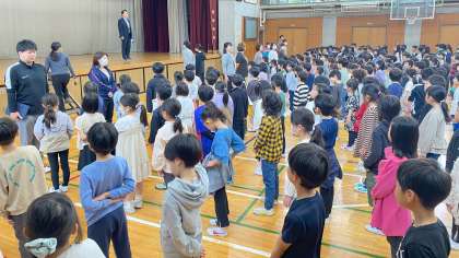 雨天のため、体育館で実施しました。校長は、小泉吉宏さんの詩『一秒の言葉』を朗読し、お話しました。看護当番の教員は、今週の目標「誰にでも気持ちのよいあいさつをしよう」について伝えました。