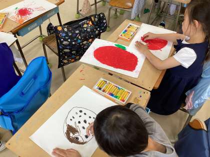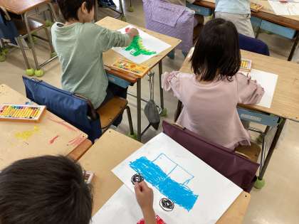 図工「すきなものいっぱい」では,自分の好きなものを色々考えて,画用紙に大きく描きました。食べ物や乗り物,動物やお花など,それぞれの好きなものをクレパスで色を工夫しながら描くことができました。