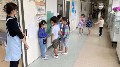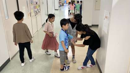 2年生は、1年生に優しく声をかけながら校舎内を案内しました。1年生は興味津々です。